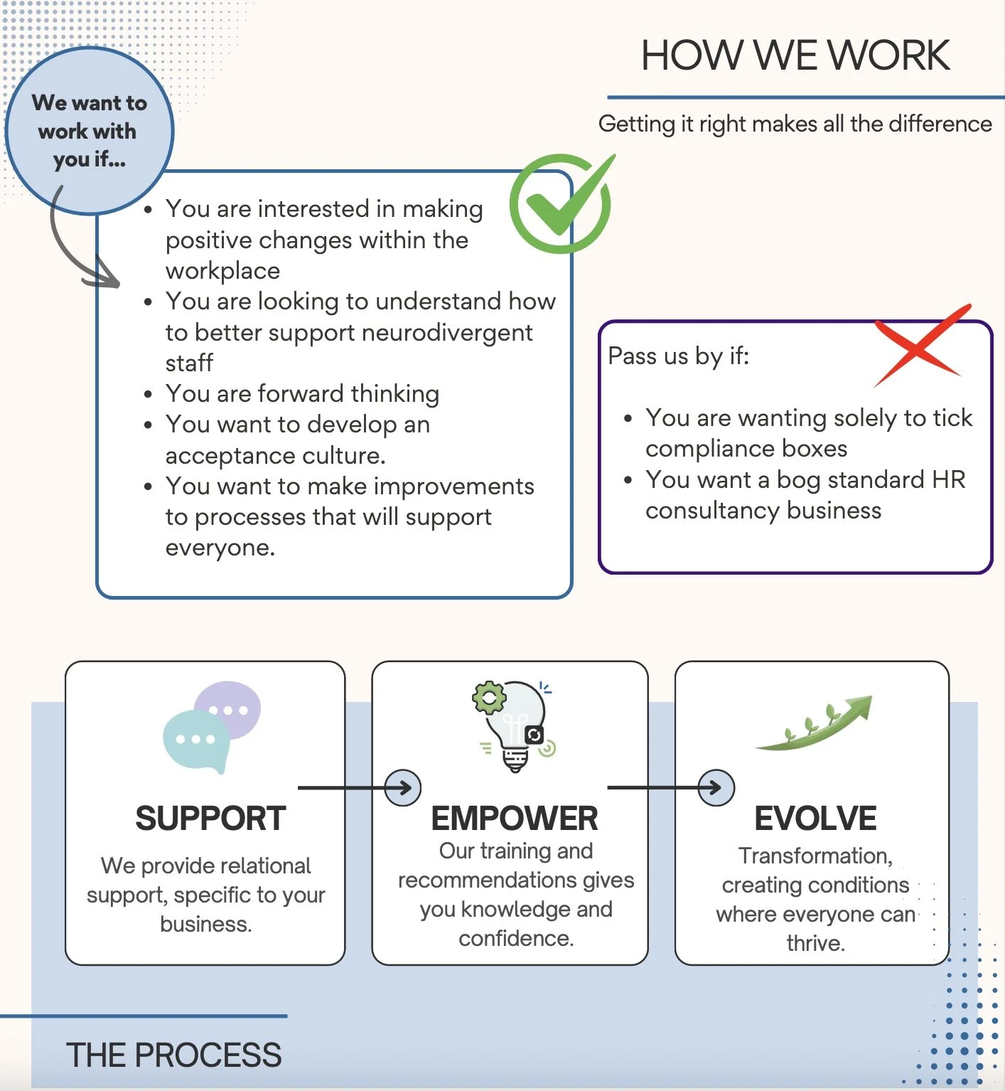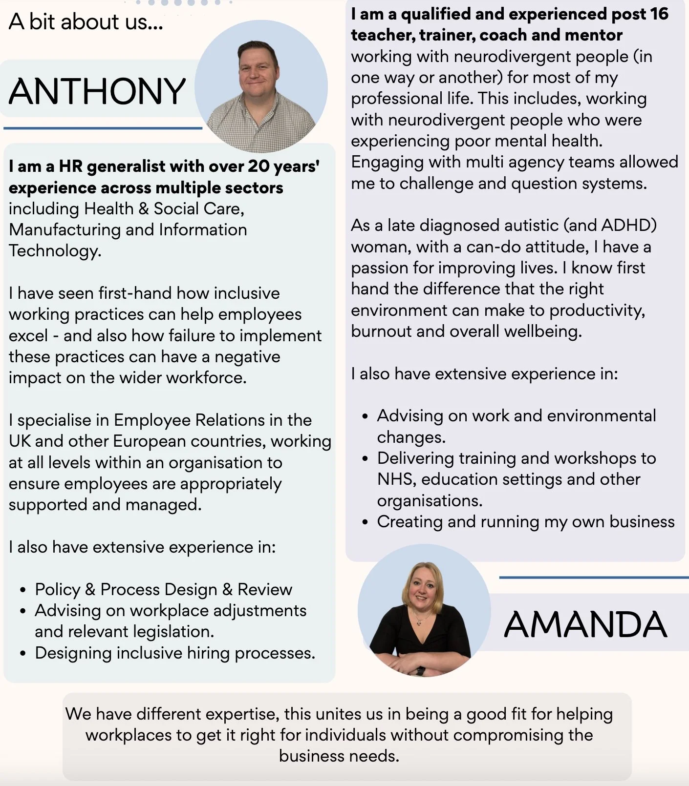 We are Amanda and Anthony. Together we partner with forward thinking organisations who are keen to develop a positive and inclusive working environment where neurodivergent individuals feel welcomed and can thrive.